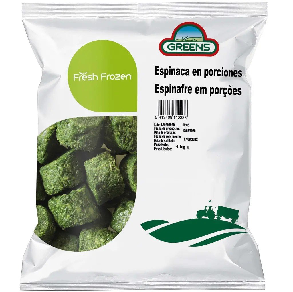Espinaca fresca seleccionada y congelada para mantener todo su color, nutrientes y frescura natural.
