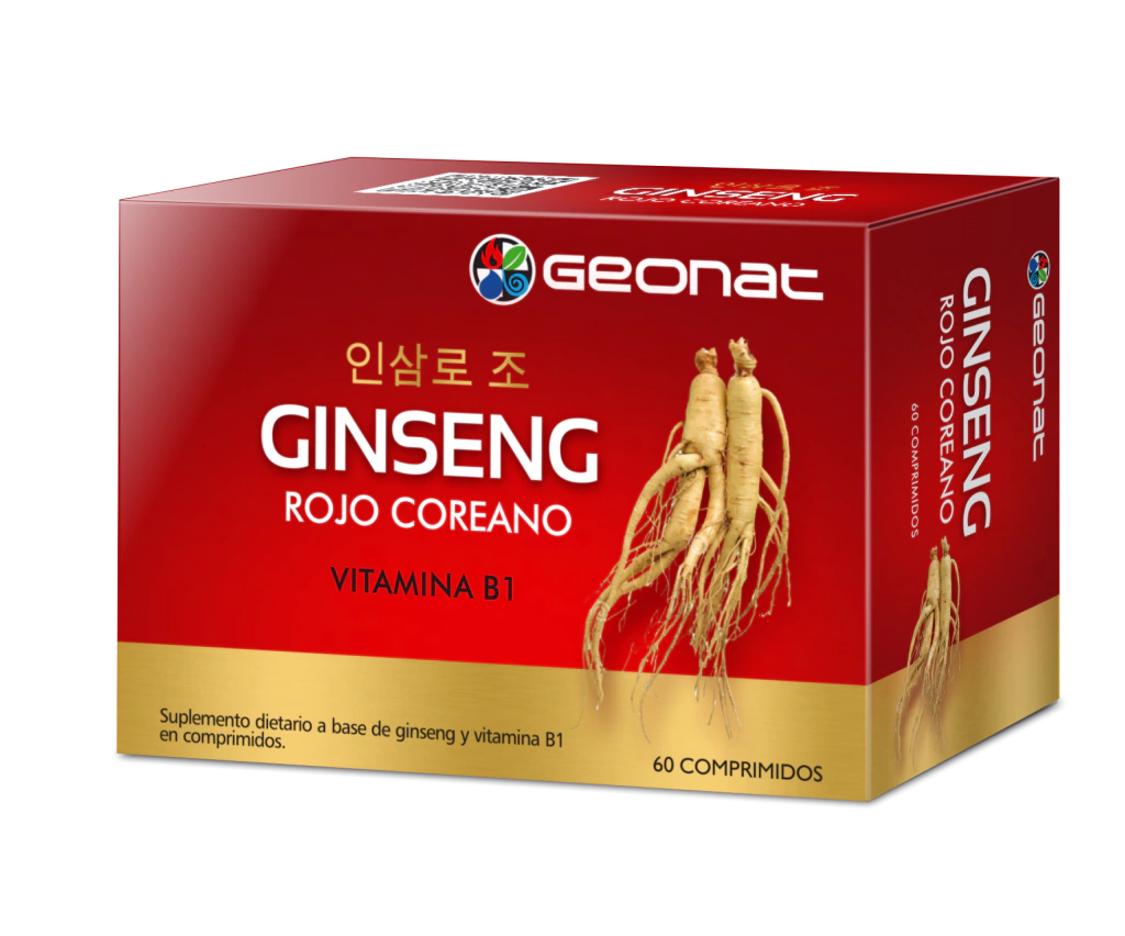 Suplemento dietario en comprimidos a base de Ginseng Rojo Coreano + Vitamina B1, formulado para brindar energía, vitalidad y apoyo cognitivo.